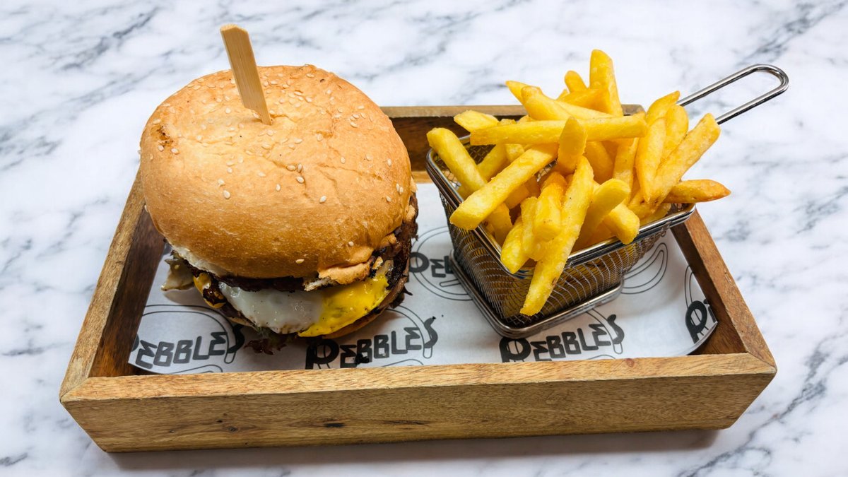 Double angus beef patty, egg, bacon, cheese, caramelised onions, lettuce, tomatoes, house sauce and fries