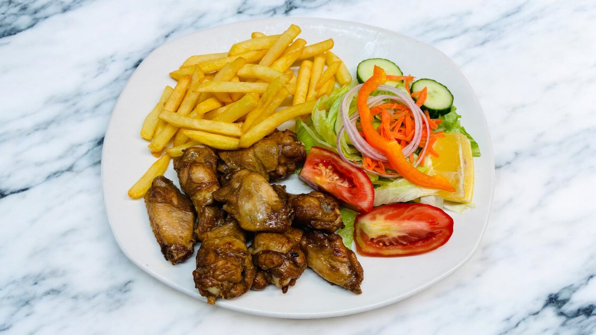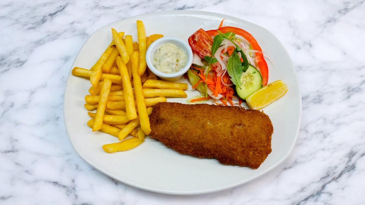 Breaded chicken breast set on a bed of lettuce, tomatoes and caramelised onions, house sauce and fries