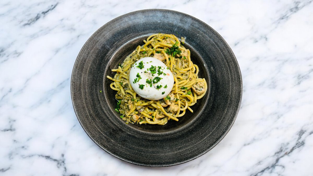 Chicken, pesto sauce, pine nuts, with pistachios and touch of burrata cheese