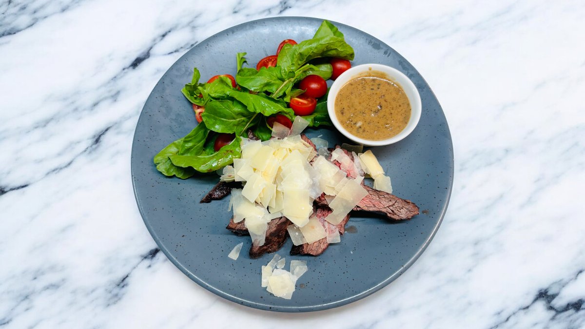 Grilled then carved into slices and served on a bed of rucola, topped with grana shavings