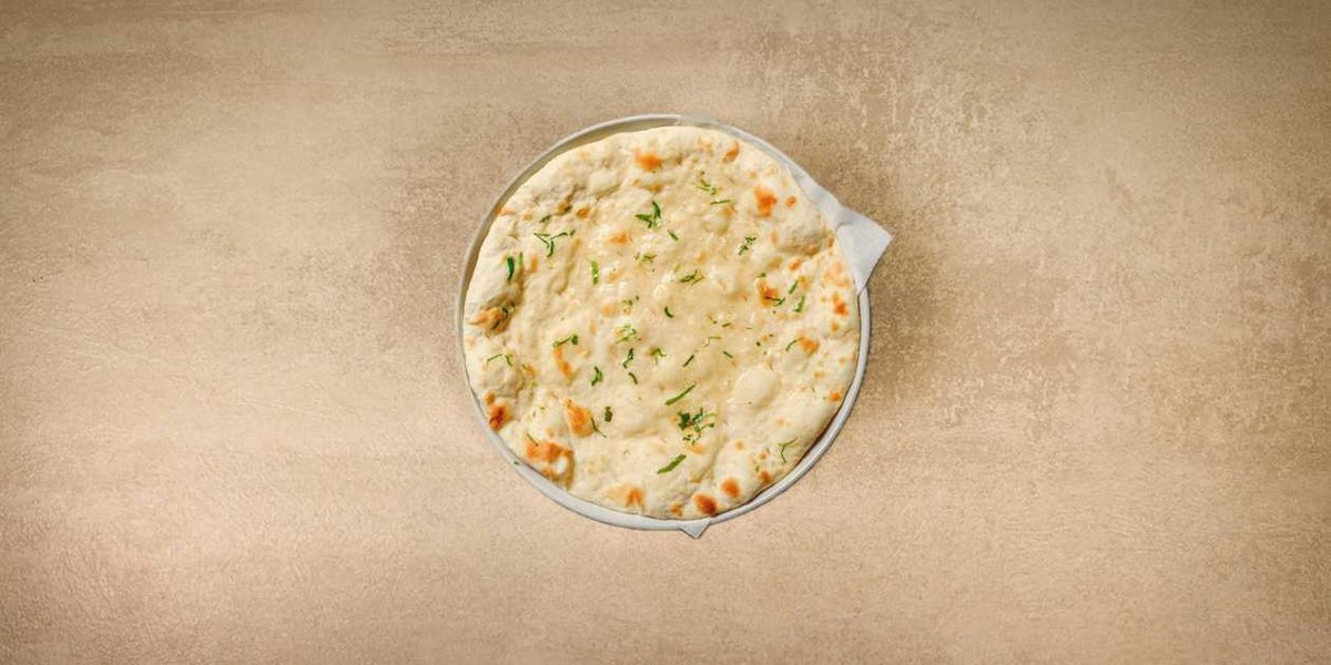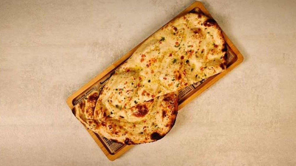 Soft white flat bread with melted butter topped with garlic and fresh chilli
