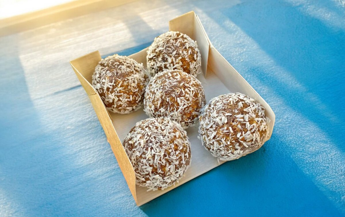 Dates, cashews and coconut Nutritional info: Calories 140 per item Carbohydrates 17.3g Protein 3.2g Fats 6.9g *may contain traces of gluten*