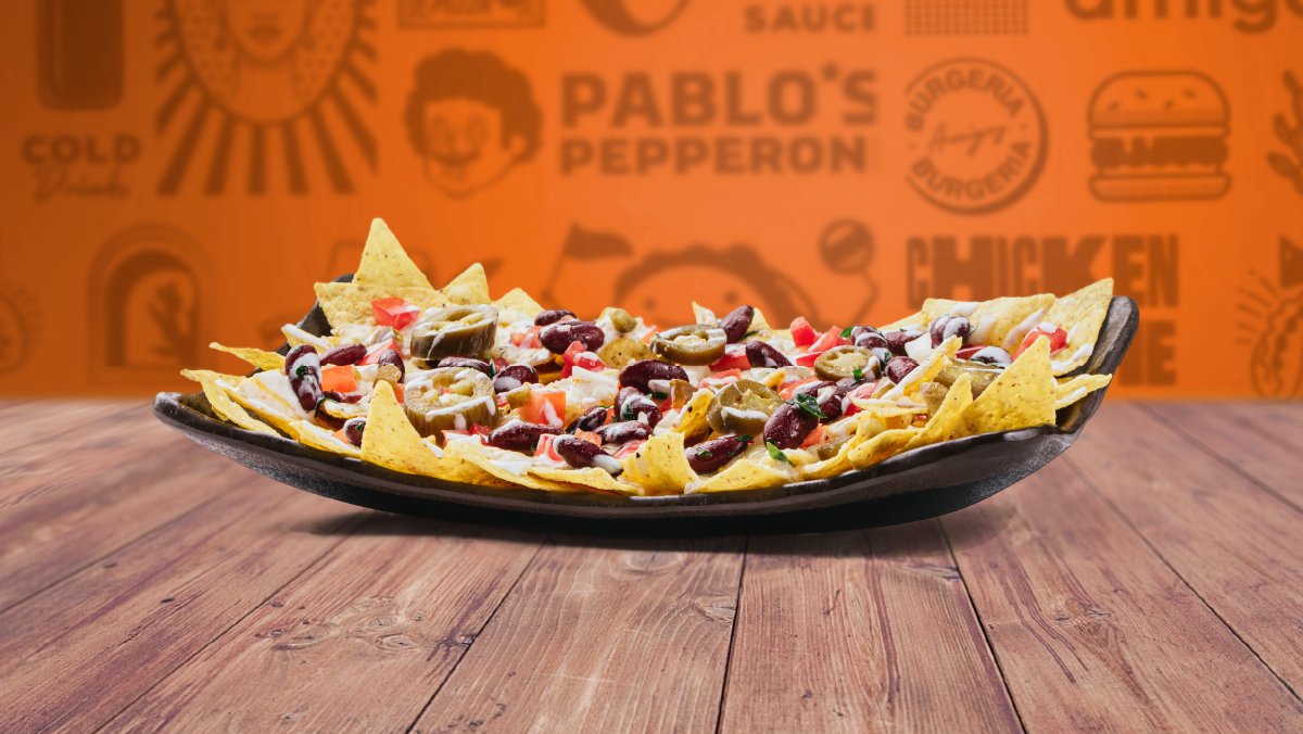 Cheese, red kidney beans, tomato salsa, jalapeños, sour cream and guacamole. Please note: cheese is not served heated and all nachos require heating as per provided instructions