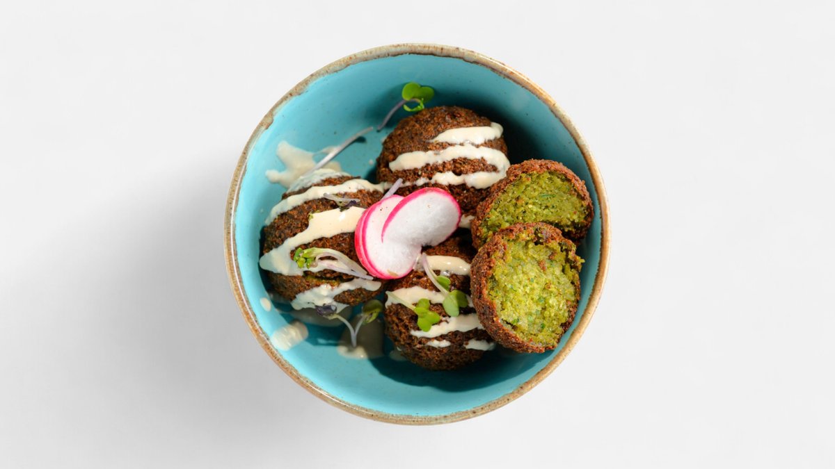 Homemade falafel served over a fresh mix of salads, wholesome grains, fermented vegetables, Micro Herbs, Tahini, Chimichurri and black rice