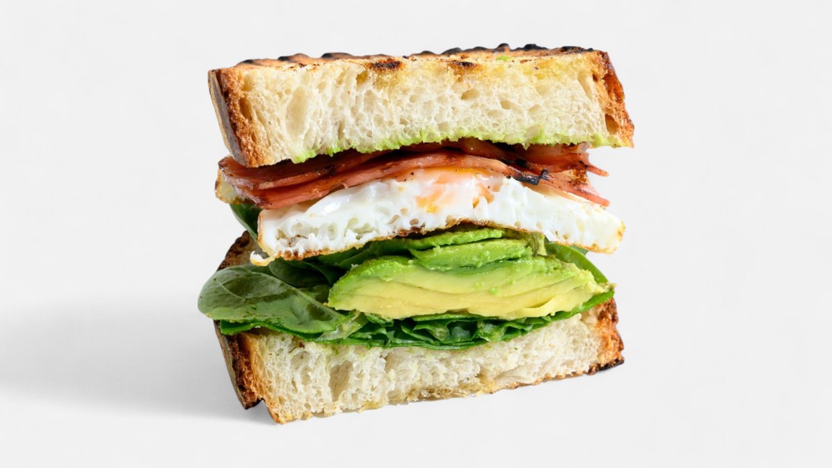 Fresh baby spinach, egg, and crispy bacon served on toasted sourdough bread