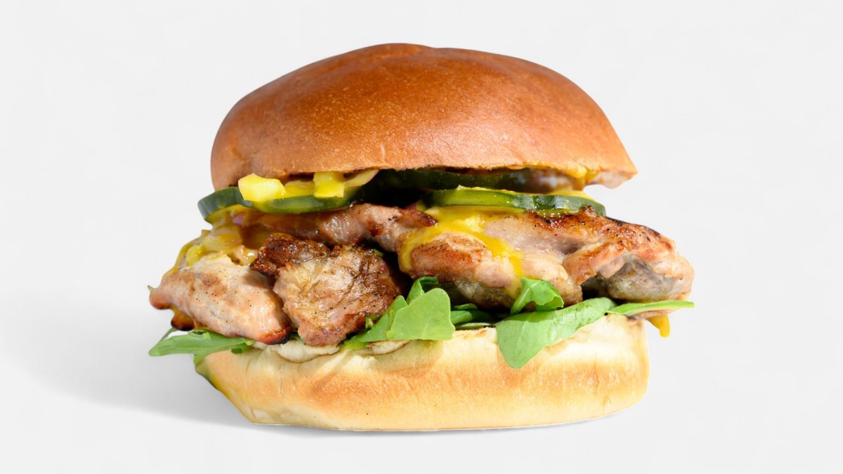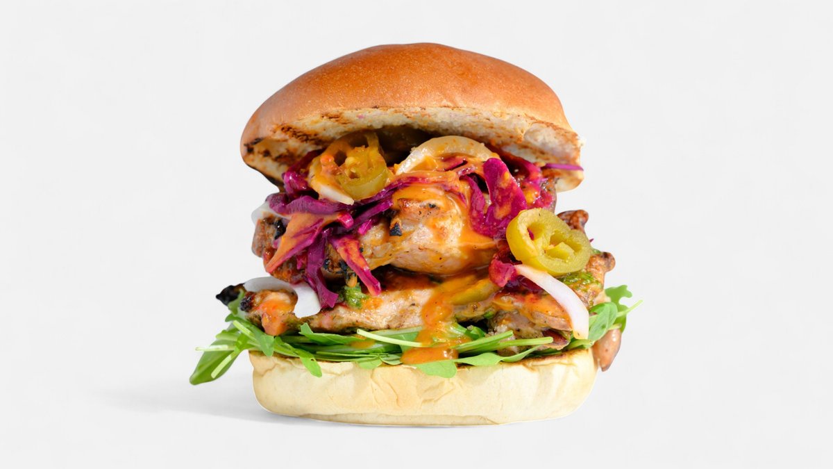 Brioche bun, 100% grilled chicken, american cheese, rucola, onion, gherkins honey and mustard dressing
