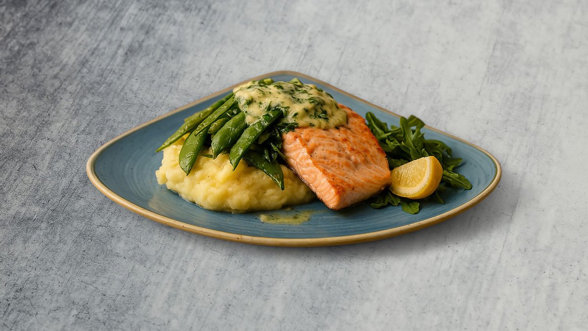 Grilled salmon fillet with dill-infused mashed potato, topped with wilted snow peas, cherry tomato, baby spinach and lemon-butter hollandaise sauce