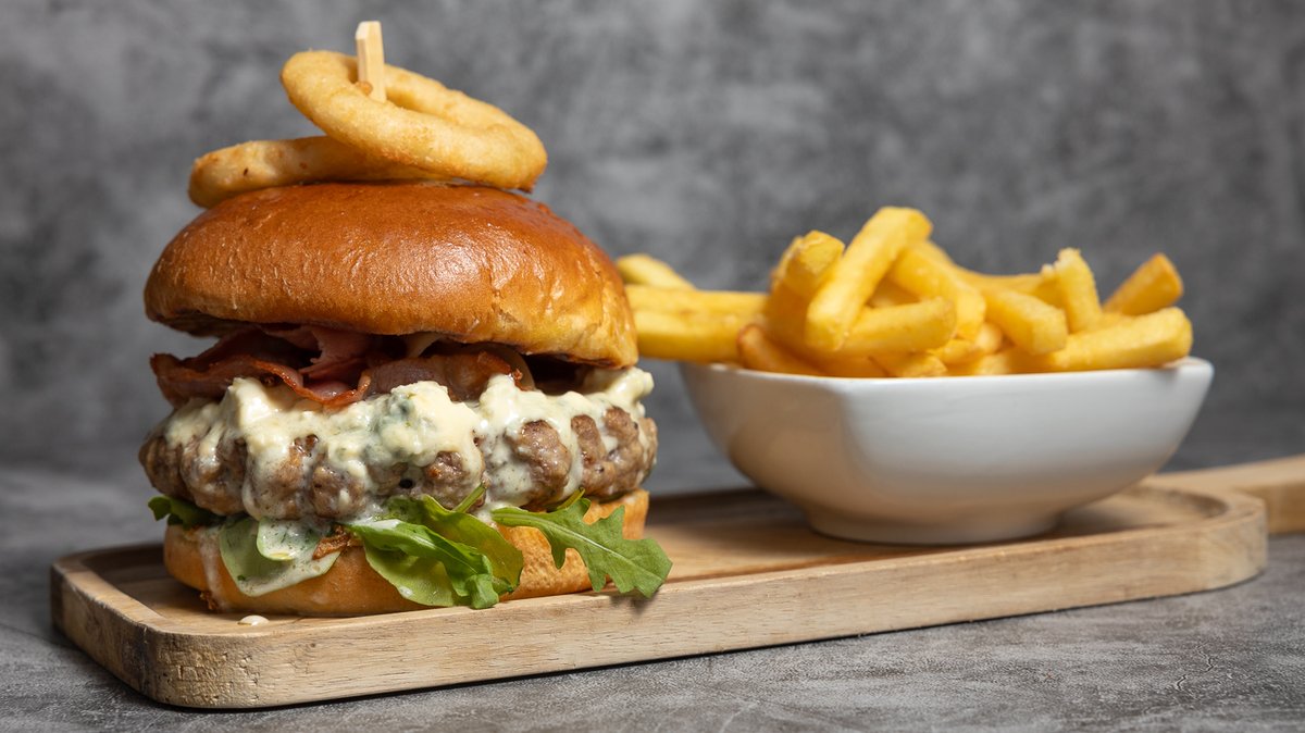 250g Angus beef patty, served with blue cheese, bacon, crispy onions and rucola