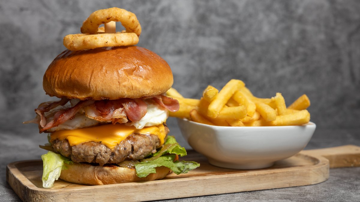 250g 100% Angus beef burger served in a brioche bun with caramelized onions, lettuce, tomatoes, cheese, bacon, fried egg, and fries