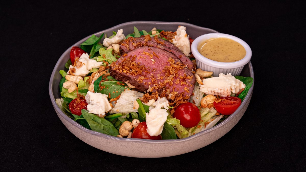 GRILLED RUMP STEAK, MIX GREENS, CHERRY TOMATOES, CASHEW NUTS, CRISPY ONIONS, CRUMBLED GORGONZOLA CHEESE, HONEY & GRAIN MUSTARD DIP