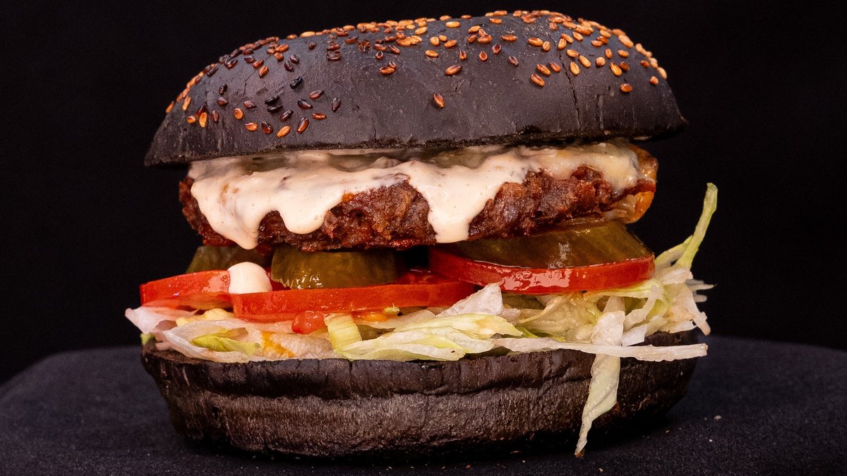 BEYOND BURGER, RAW ONIONS, LETTUCE, TOMATO, GHERKINS, VEGAN MOZZARELLA, HOME-MADE VEGAN RELISH, TOASTED CHARCOAL BUN, FRIES