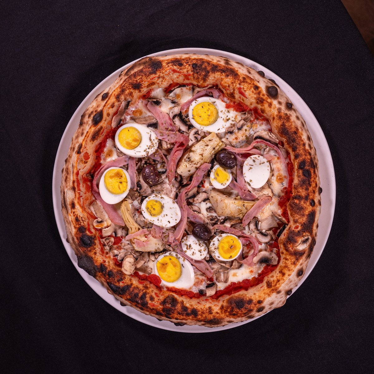 SAN MARZANO TOMATO SAUCE, MOZZARELLA FIOR DI LATTE, PROSCIUTTO COTTO, MUSHROOMS, EGG, ARTICHOKES, BLACK OLIVES, OREGANO