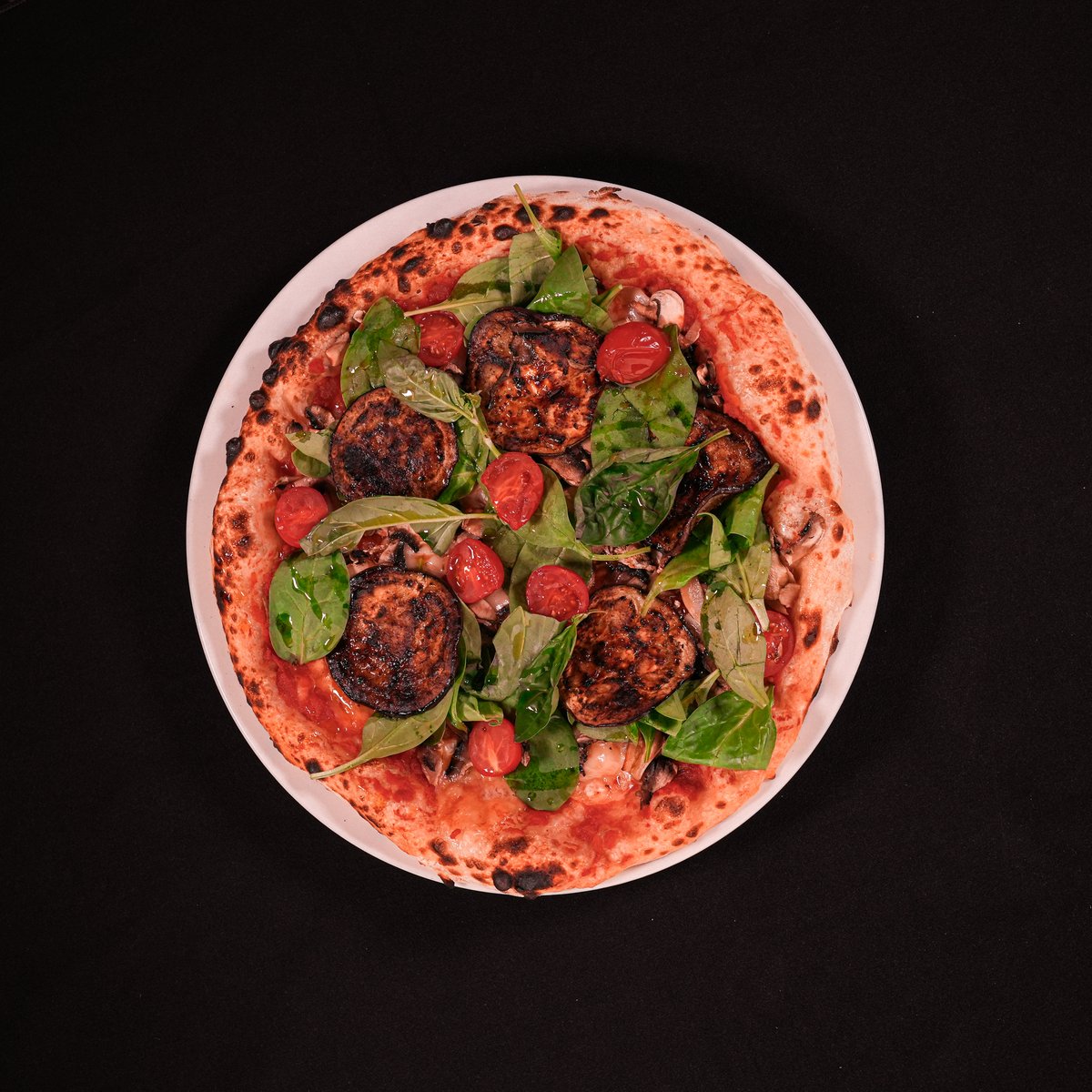 VEGAN MOZZARELLA, SAN MARZANO TOMATO SAUCE , BABY SPINACH, CHERRY TOMATOES, MUSHROOMS, AUBERGINES, BASIL OLIVE OIL