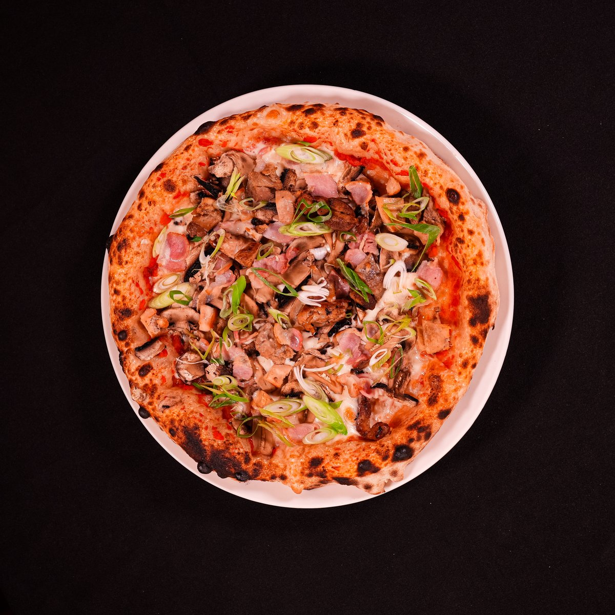 MOZZARELLA FIOR DI LATTE, GRILLED CHICKEN, BACON, MUSHROOM, SPRING ONION