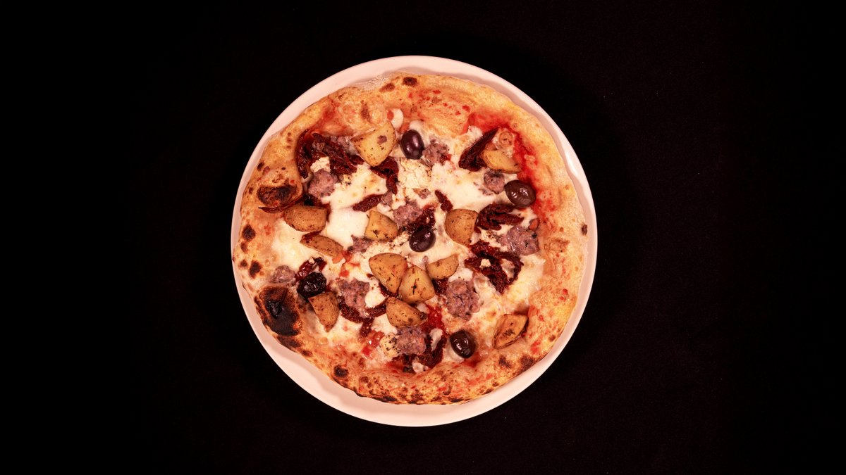SAN MARZANO TOMATO SAUCE, MOZZARELLA FIOR DI LATTE, PEPPERED GOAT CHEESE, MALTESE SAUSAGE, POTATOES, SUNDRIED TOMATOES, BLACK OLIVES