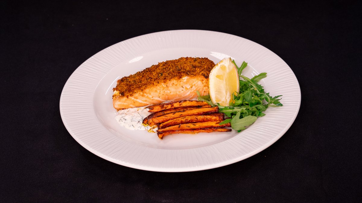 SALMON FILLET WITH SUNDRIED TOMATO & PARSLEY CRUSTED, CREAM CHEESE, LEMON DILL CREAM, SERVED WITH HONEY GLAZED CARROTS AND FRIES