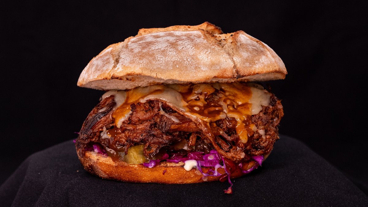 SMOKED PULLED BEEF, PICKLED RED CABBAGE, GHERKINS, CARAMELISED ONIONS, CHEDDAR CHEESE, HOME-MADE BBQ SAUCE, TOATED HASHTAG BUN, FRIES