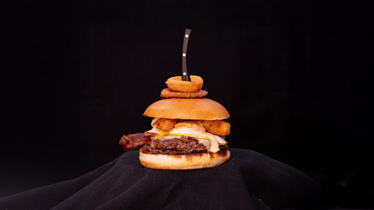 200g BEEF BURGER PATTIE, CHEDDAR CHEESE, FRIED EGG, CARAMELISED ONIONS, CRISPY CHICKEN BITE, BEER BATTERED ONION RINGS, HOME-MADE BURGER RELISH, TOASTED BRIOCHE BUN, FRIES