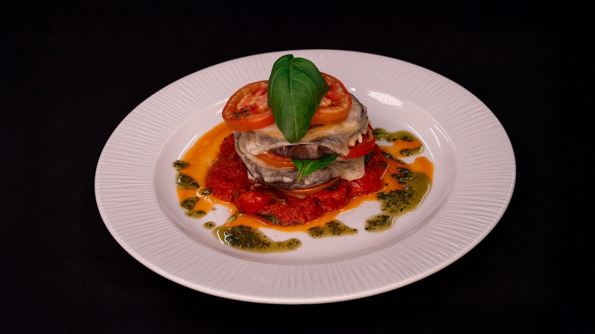 GRILLED LAYERS OF AUBERGINES, VEGAN MOZZARELLA, TOMATO SLICES, PISTACHIO PESTO, TOMATO SAUCE, SERVED WITH FRIES