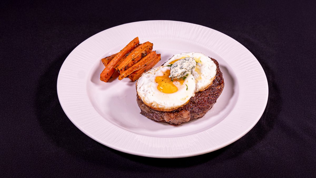 300G GRILLED BEEF RIBEYE STEAK, 2 FRIED EGGS, GARLIC PARSLEY BUTTER, SERVED WITH HONEY GLAZED CARROTS AND FRIES