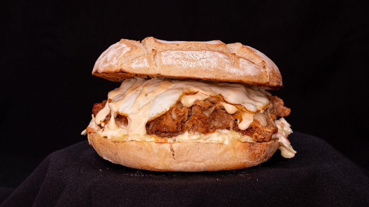 SMOKED PULLED PORK, FRIED EGG, CHEDDAR CHEESE, COLESLAW, HONEY MUSTARD MAYO SAUCE, TOASTED HASHTAG BUN, FRIES