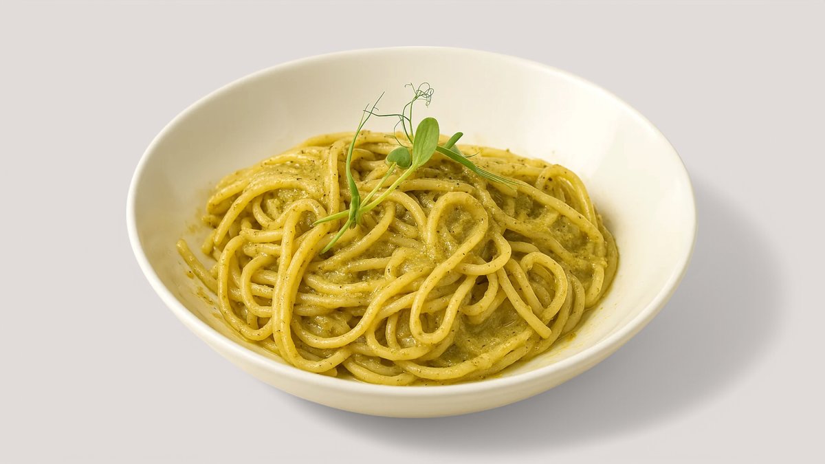 Pasta rolled with fresh cream. mortadella, pistachio, parmesan shavings topped with pesto cream