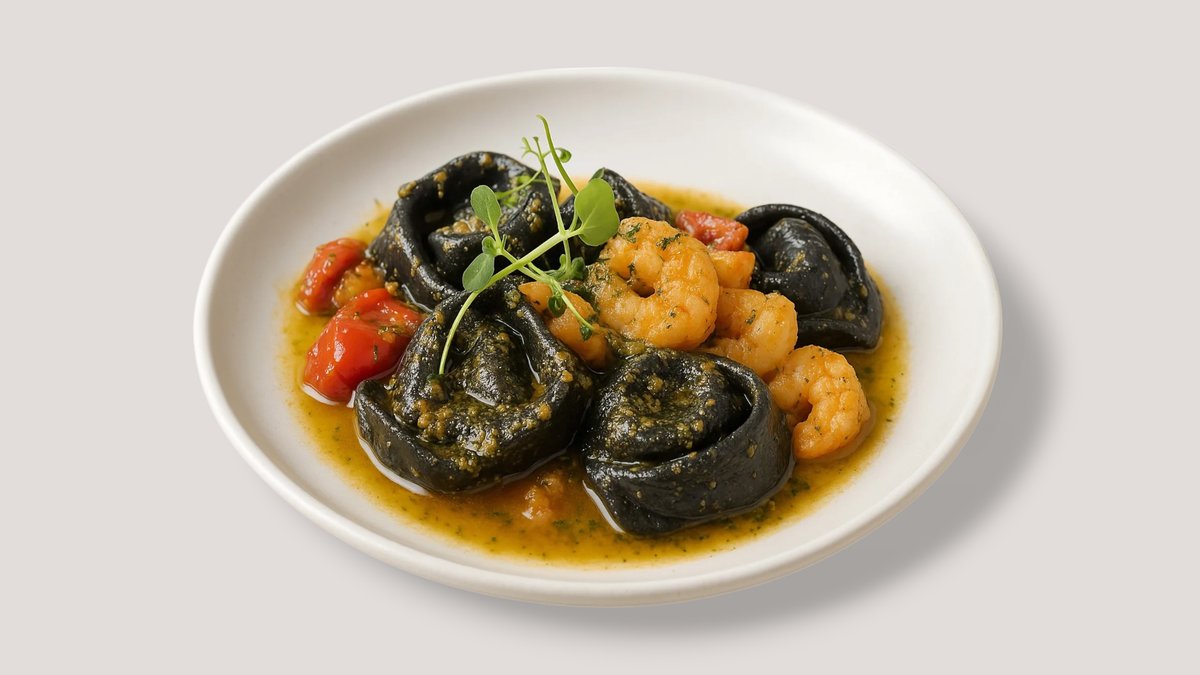 Fresh cuttlefish ink dough, stuffed with fresh salmon fillets, served aglio olio with shrimp, and cherry tomatoes