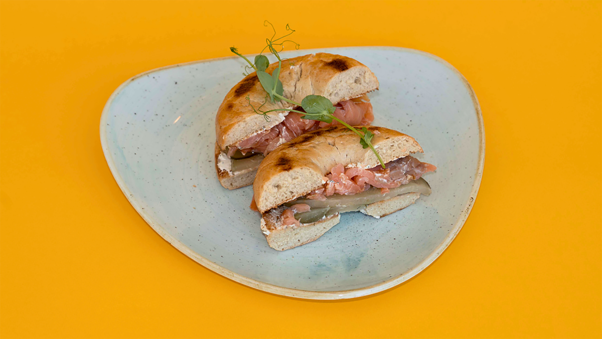 Bagel, smoked salmon, gherkins, dill cream cheese (Gluten, Milk, Fish)