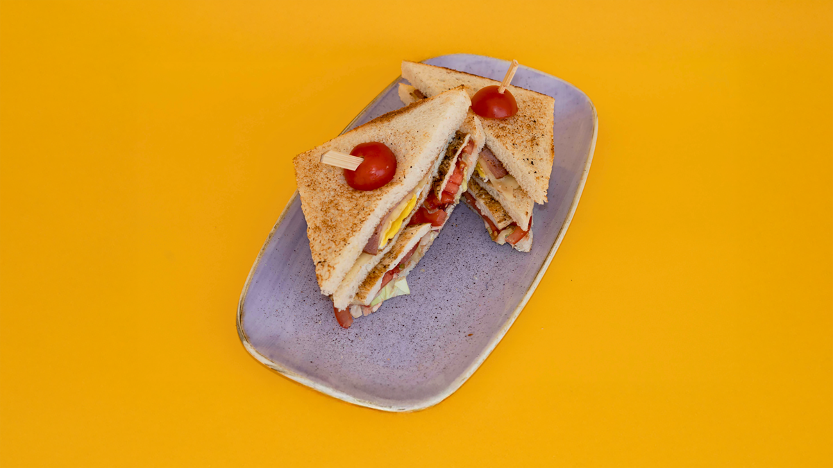 A triple-decker of toasted bread with chicken, bacon, mature cheese, egg, lettuce & tomato (Gluten, Eggs, Milk)