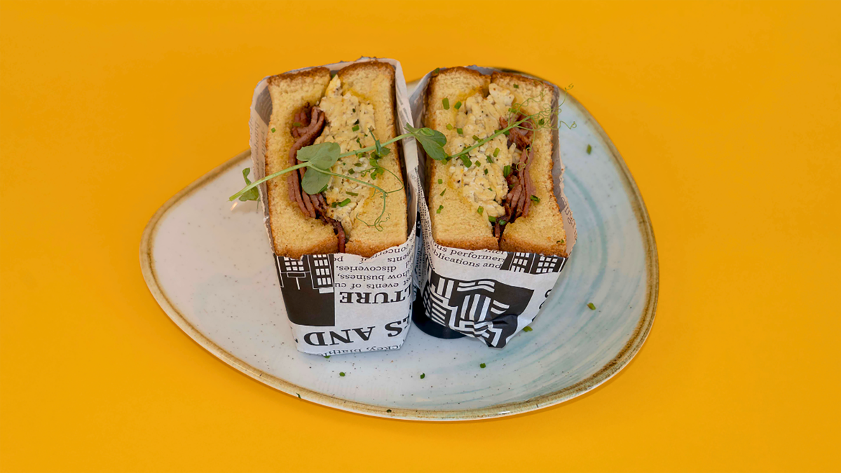 brioche bread, creamy scrambled eggs, crispy streaky bacon, mature cheddar, and chives (Gluten, Eggs, Milk)