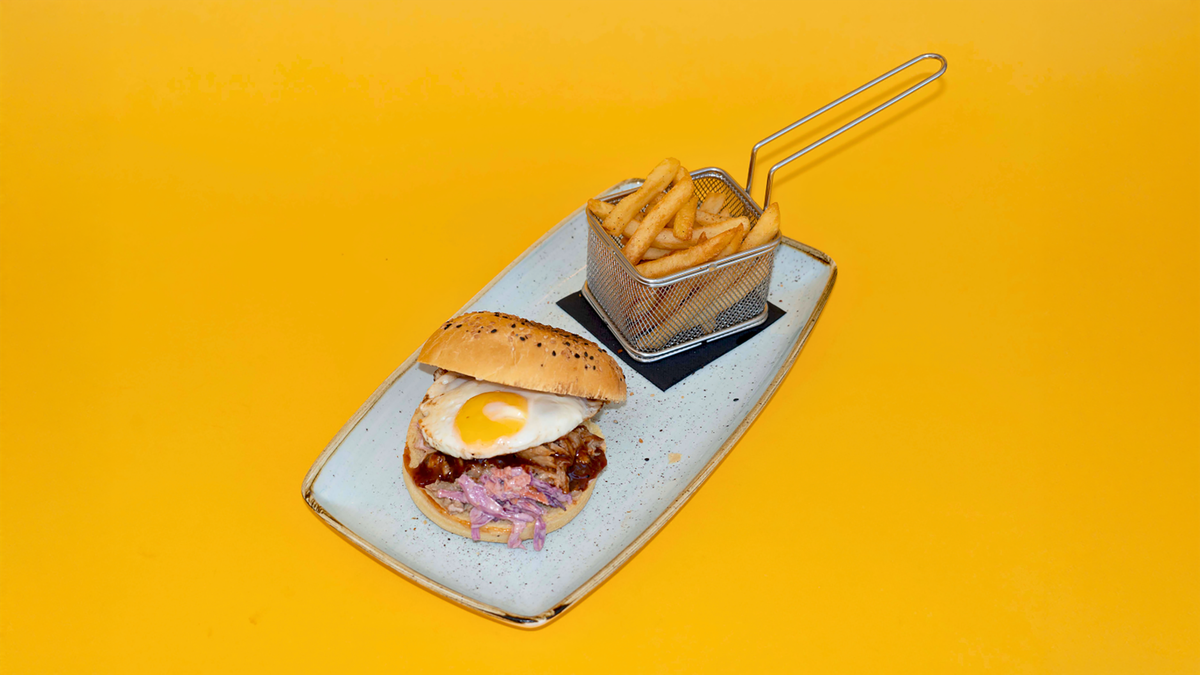 Brioche bun, Pulled pork, Lime rainbow slaw, fried egg, and BBQ sauce (Gluten, Eggs, Mustard)
