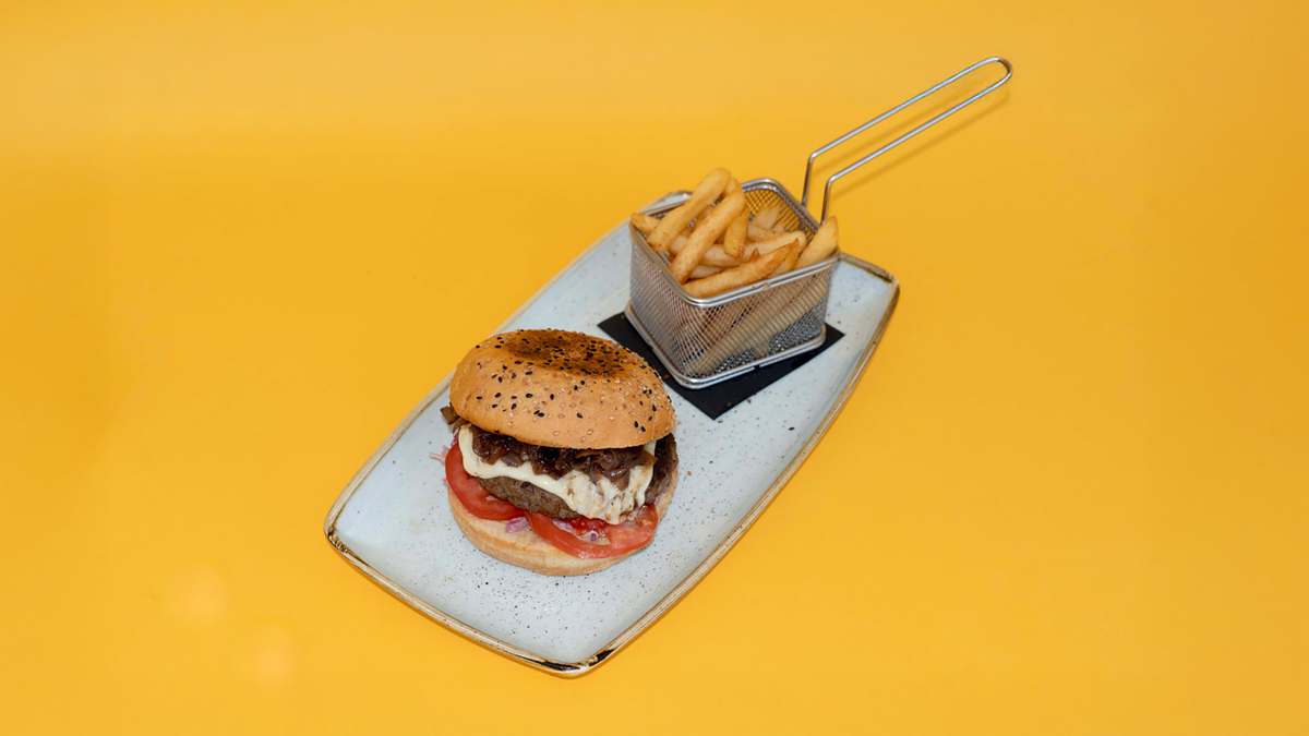 Brioche bun, lettuce, tomatoes, caramelized onions, and cheese