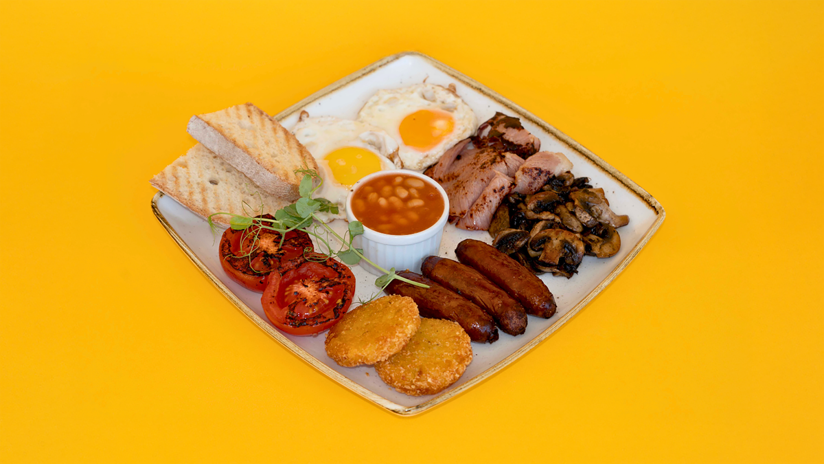 Grilled tomatoes, two pork & beef sausages, 2 fried eggs, sauté mushrooms, brioche bread, baked beans, collar bacon, hash brown (Gluten, Eggs, Milk, Celery, Sulphur)