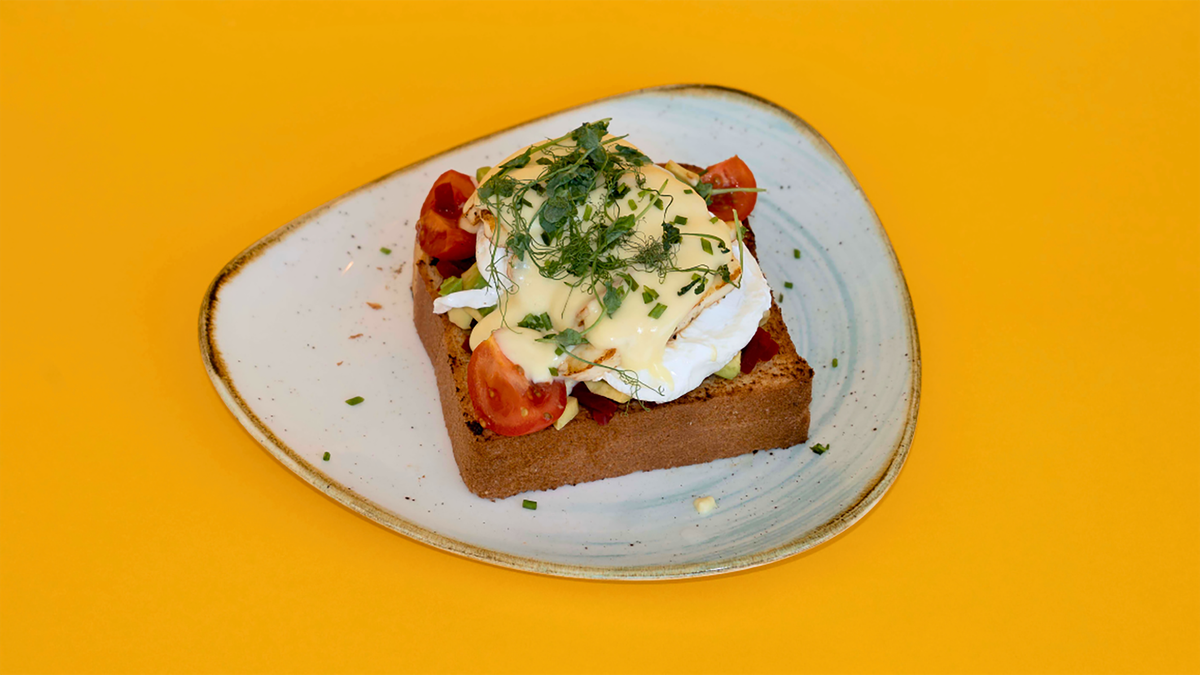two poached eggs, seasoned smashed avocado, cherry tomatoes, grilled halloumi, beetroot hummus, lemon wedge on a thick slice of brioche bread (Gluten, Eggs, Milk, Sesame)