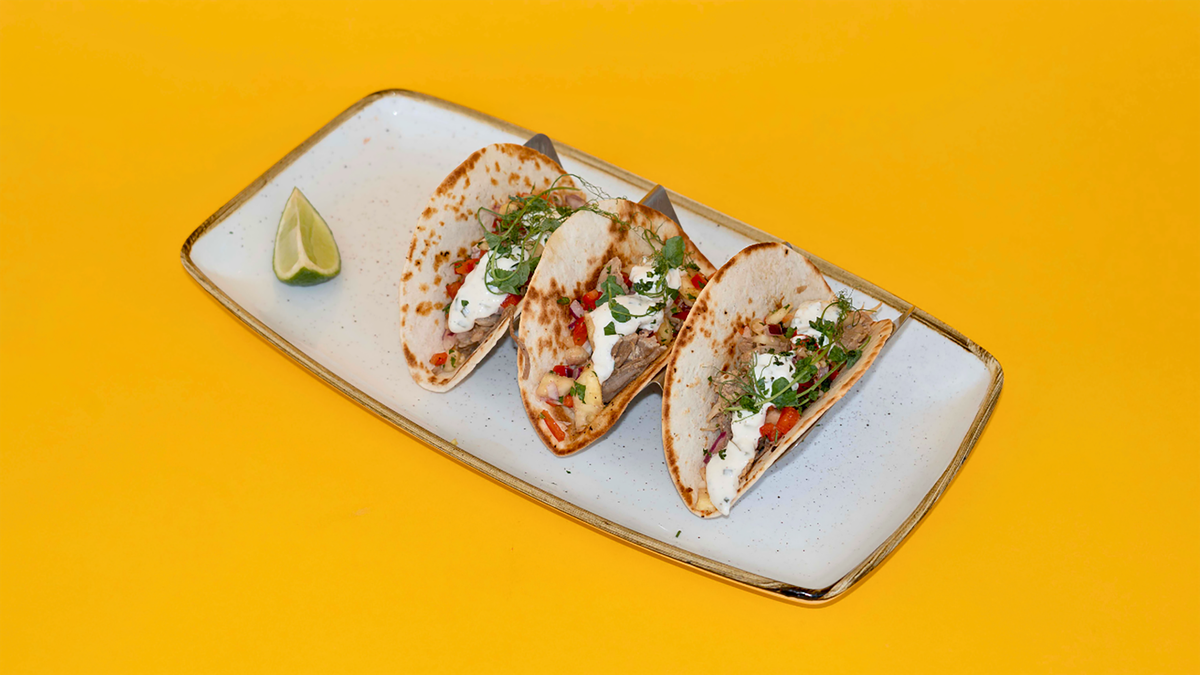 Soft-shell tacos with marinated pulled pork, grilled pineapple salsa, Peruvian-style green sauce, coriander, and lime (Gluten, Sulphur, Milk, Egg, Mustard)