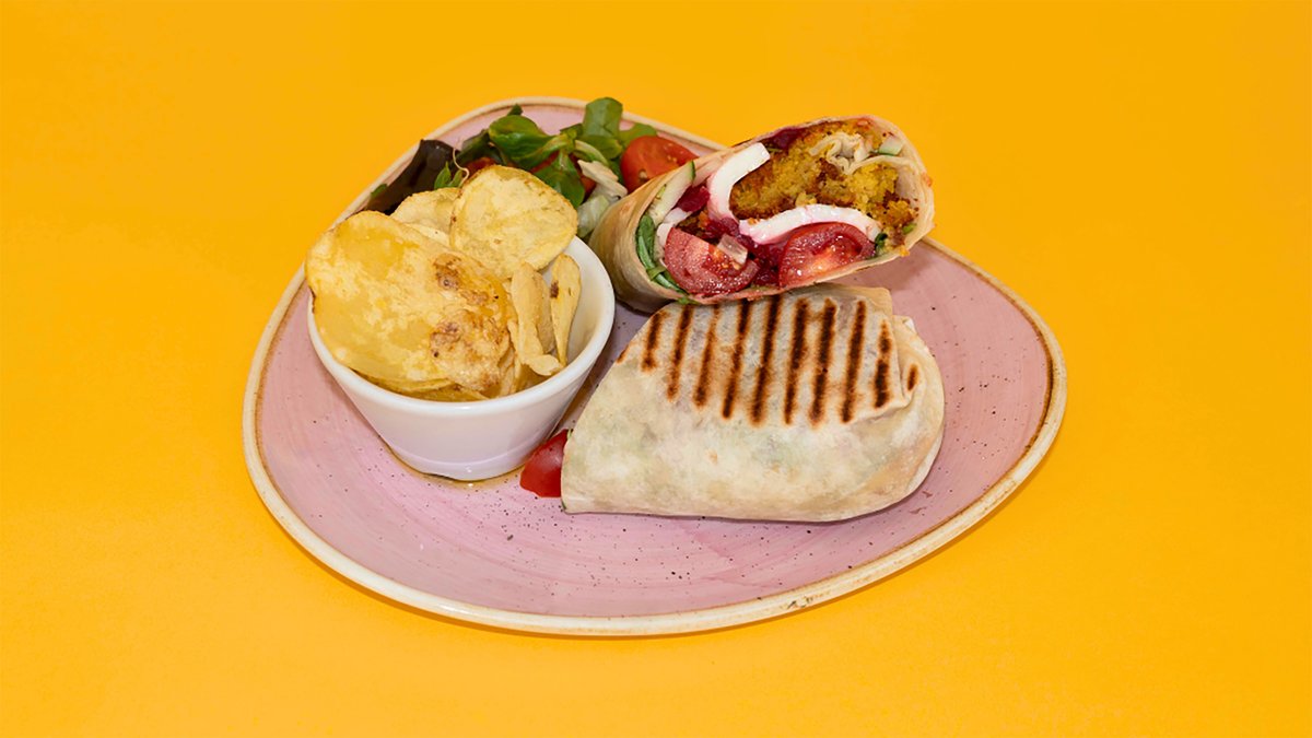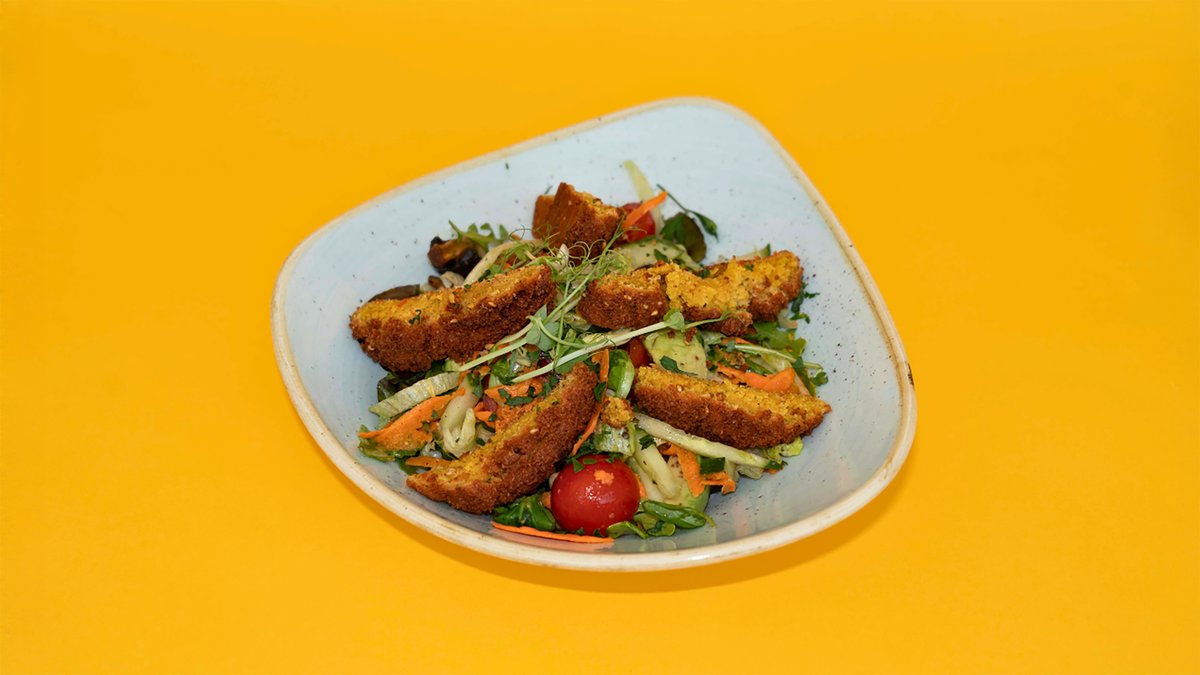 Three crispy falafel, crispy mixed leaves, avocado, sautéed mushrooms, sweet corn, cherry tomatoes, cucumber, shredded carrots, drizzled with zesty lemon dressing