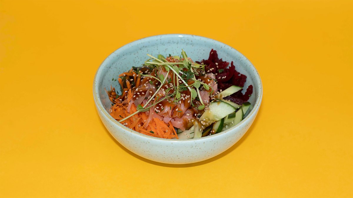 Jasmine rice, Crispy mix, edamame beans, avocado, cucumber, sesame seeds, shredded carrots, beetroot, Teriyaki glaze with Salmon