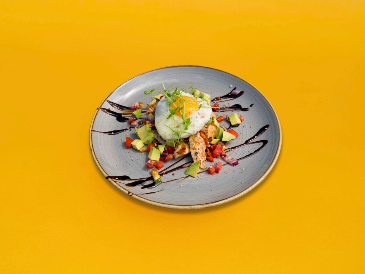 Char-grilled boneless chicken thighs marinated with oregano, lemon zest, garlic, chili, and parsley, served with a fried egg, creamy avocado, fresh zucchini, tangy tomato salsa, and corn green chili.