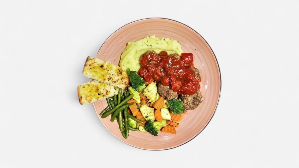 Homemade black angus meatballs, mashed potato, marinara sauce, roasted vegetables