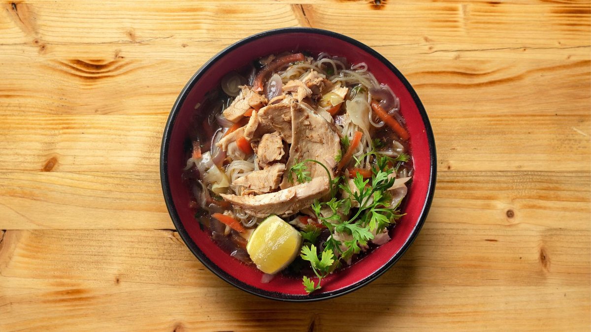 Homemade chicken noodle soup with shredded veg, fresh coriander and rice noodles