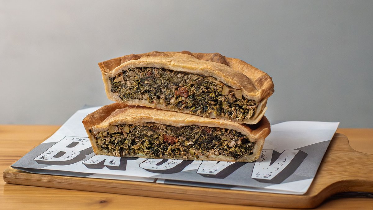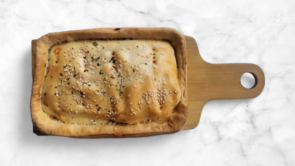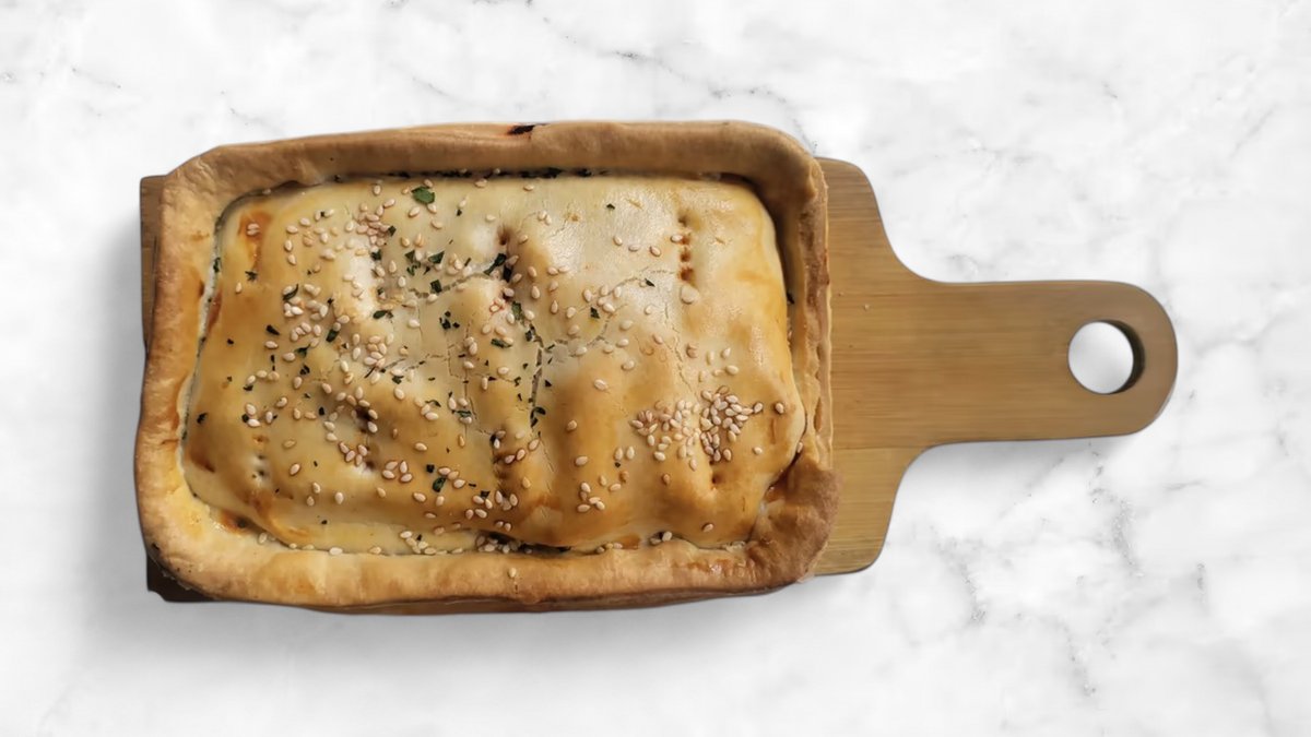 Homemade Maltese timpana with vegan bolognese sauce and a sprinkle of peas, just like Nanna used to make (or pretty close).