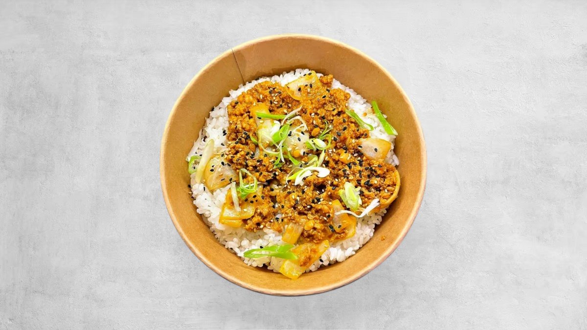 Rice base, topped with Hawaiian inspired ground pork with onions, green spring onions, and sesame seeds.
