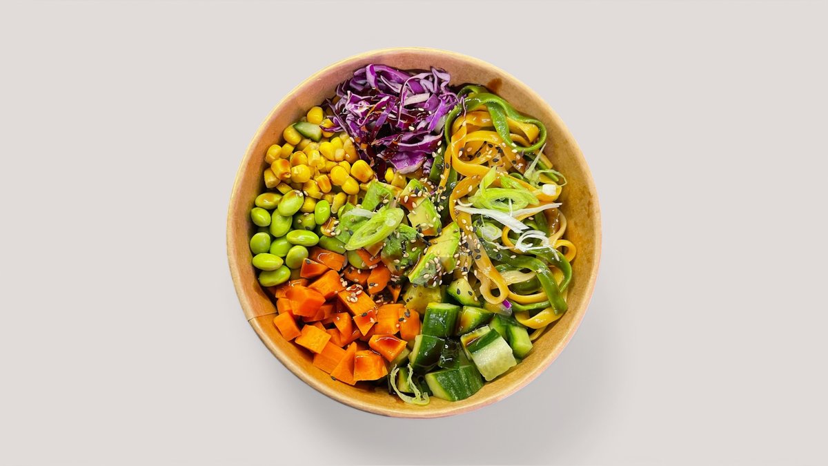 Vegetable noodle (Spinach, carrot & wheat noodles), topped with TF eel sauce, avocado, purple cabbage, cucumber, carrots, edamame beans, spring onions, sweet corns, and sesame seeds, inspired by Hawaiian Somen