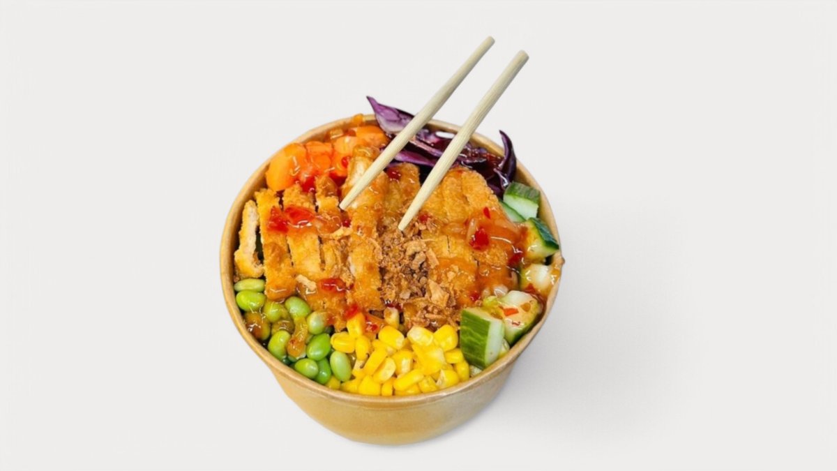 A rice base topped with sweet chilli and spicy mayo, crunchy and crispy katsu chicken, cucumber, cabbage, carrot, edamame bean, sweet corn and topped with black pepper and crispy onion