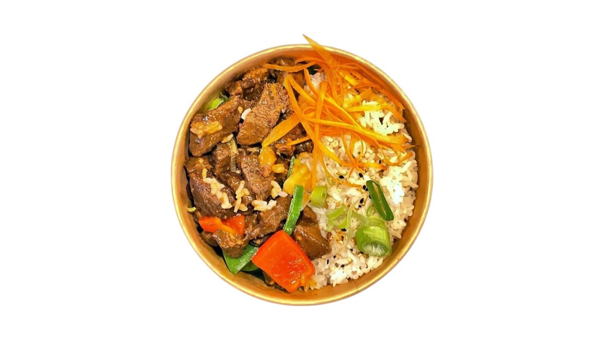 A dish featuring tender beef brisket slow-cooked with tangy tomato flavorful sauce, served over warm rice, topped with red & green peppers (or carrots), onions & sesame seeds.