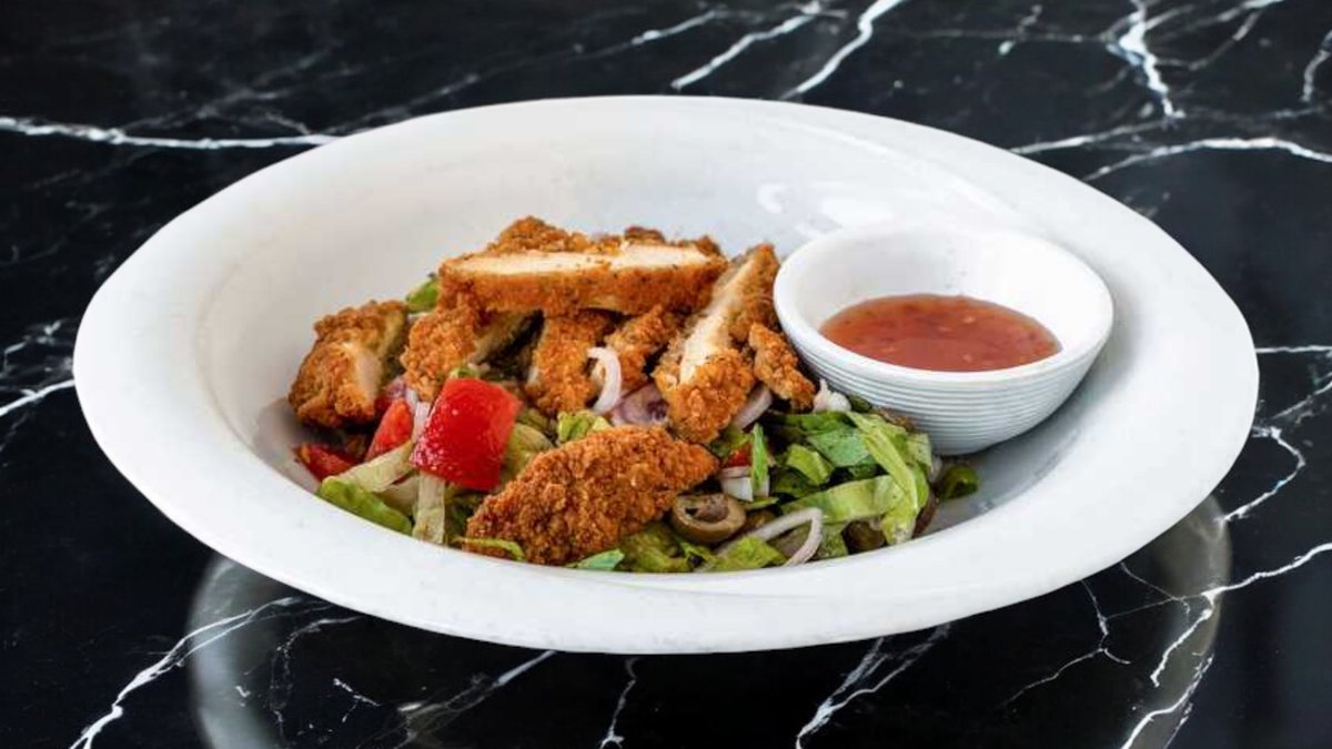 Sfc crispy chicken breast on a bed of lettuce, tomatoes, onion, olives, sweet corn and sweet chilli