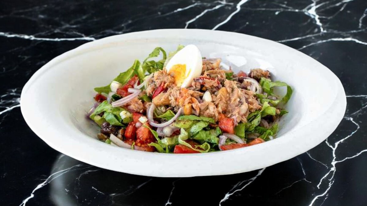 Tuna, boiled egg, mixed beans, lettuce, tomatoes, onions, olives and herb oil