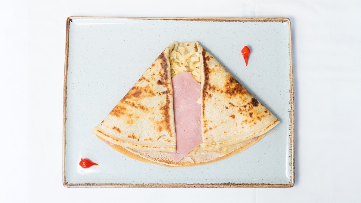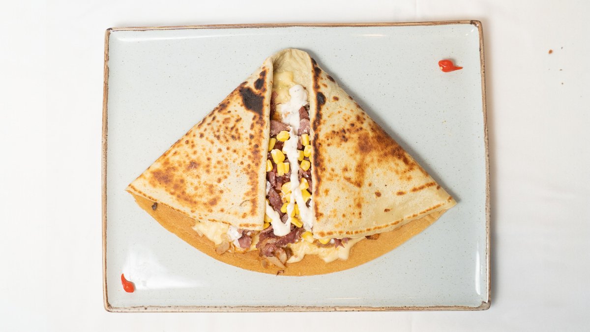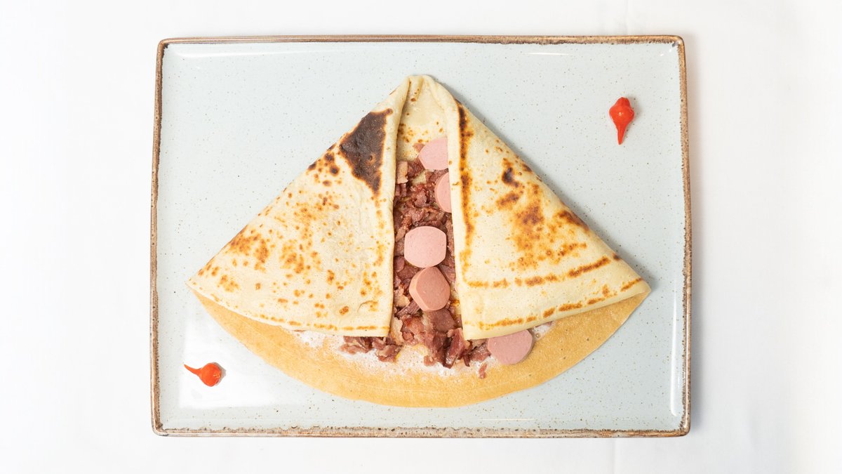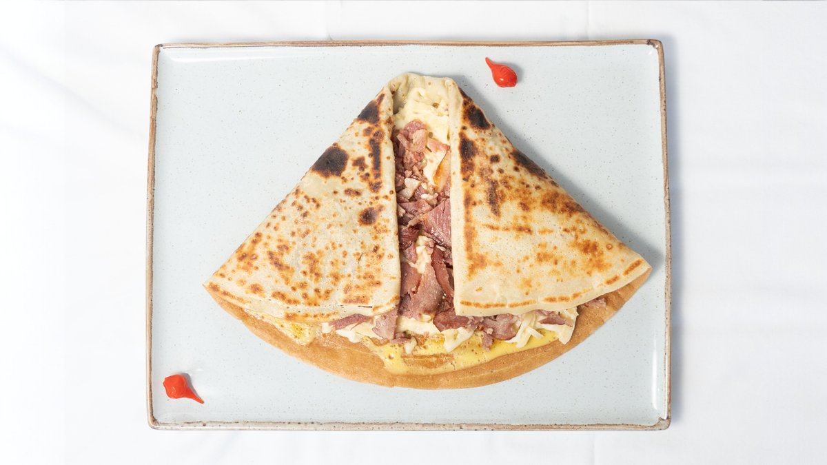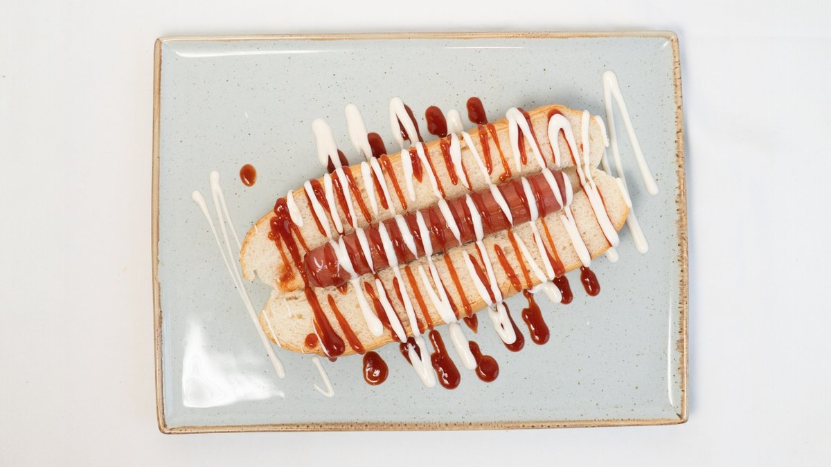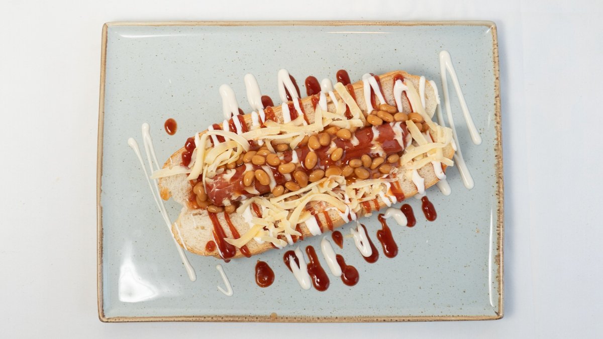Bread, crispy onions, bacon, sausage, baked beans, edam cheese, mayo and ketchup