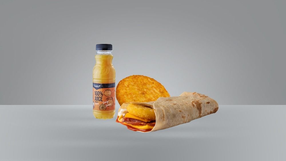 Wrap with bacon, folded egg, toast hashbrown, ketchup, mayo and cheese. Comes with Toast hashbrown and drink.