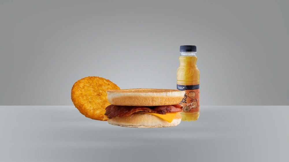 English muffin with double bacon, round egg, cheese and butter. Comes with Toast hashbrown and drink